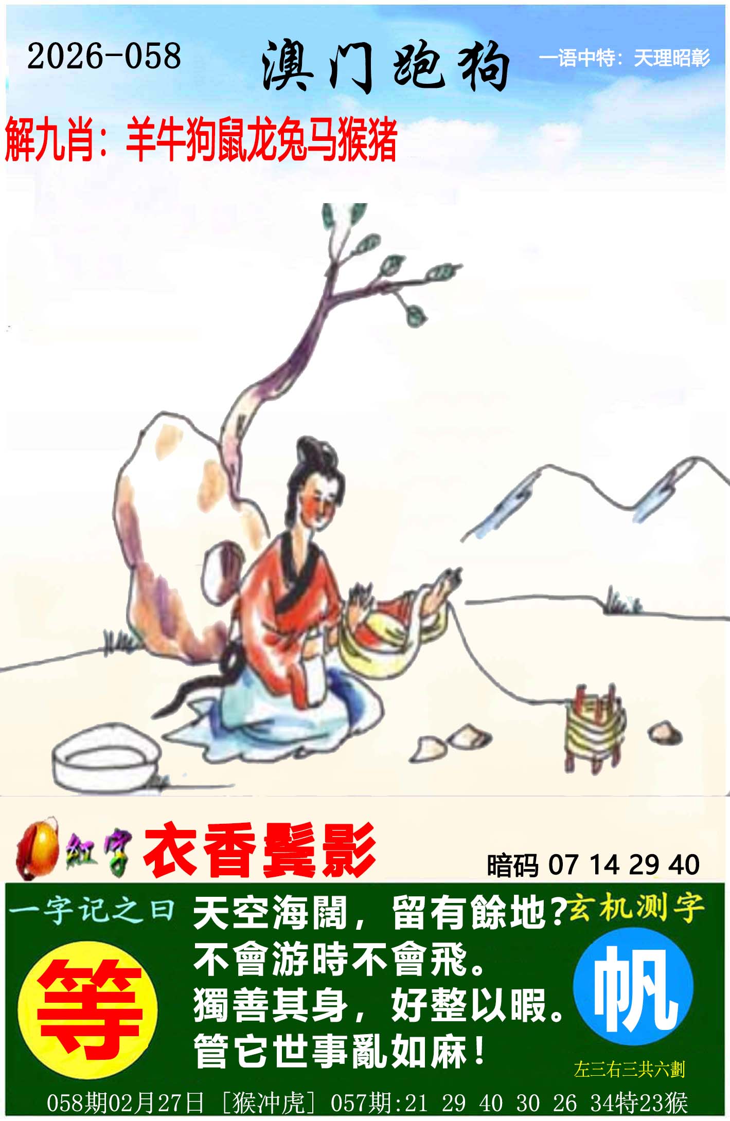 058期:⑨肖 | 猴猪马鼠牛虎狗龙羊 | 开:?00中 |