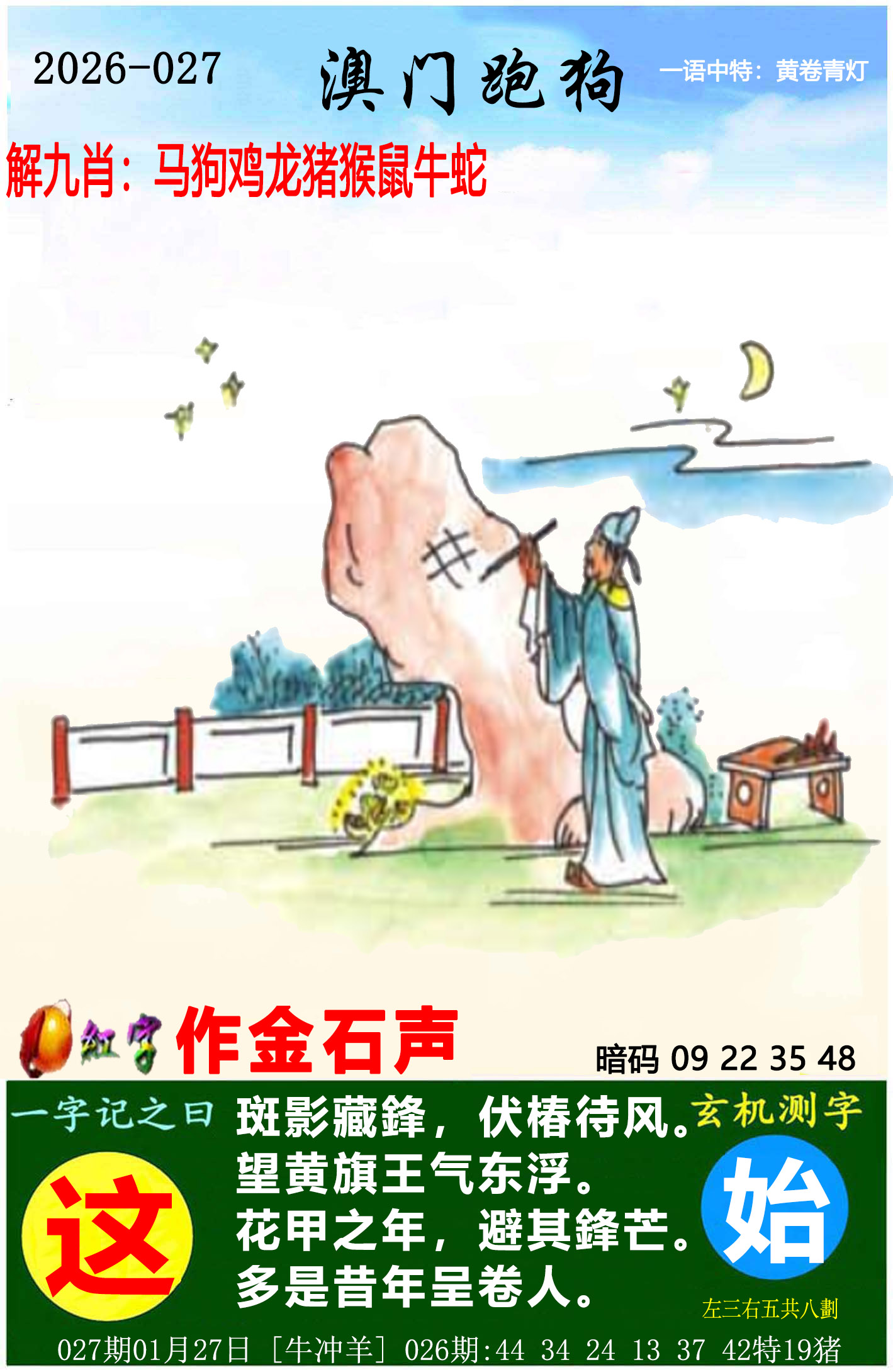 027期:⑨肖 | 猴马牛虎羊狗鸡龙鼠 | 开:?00中 |